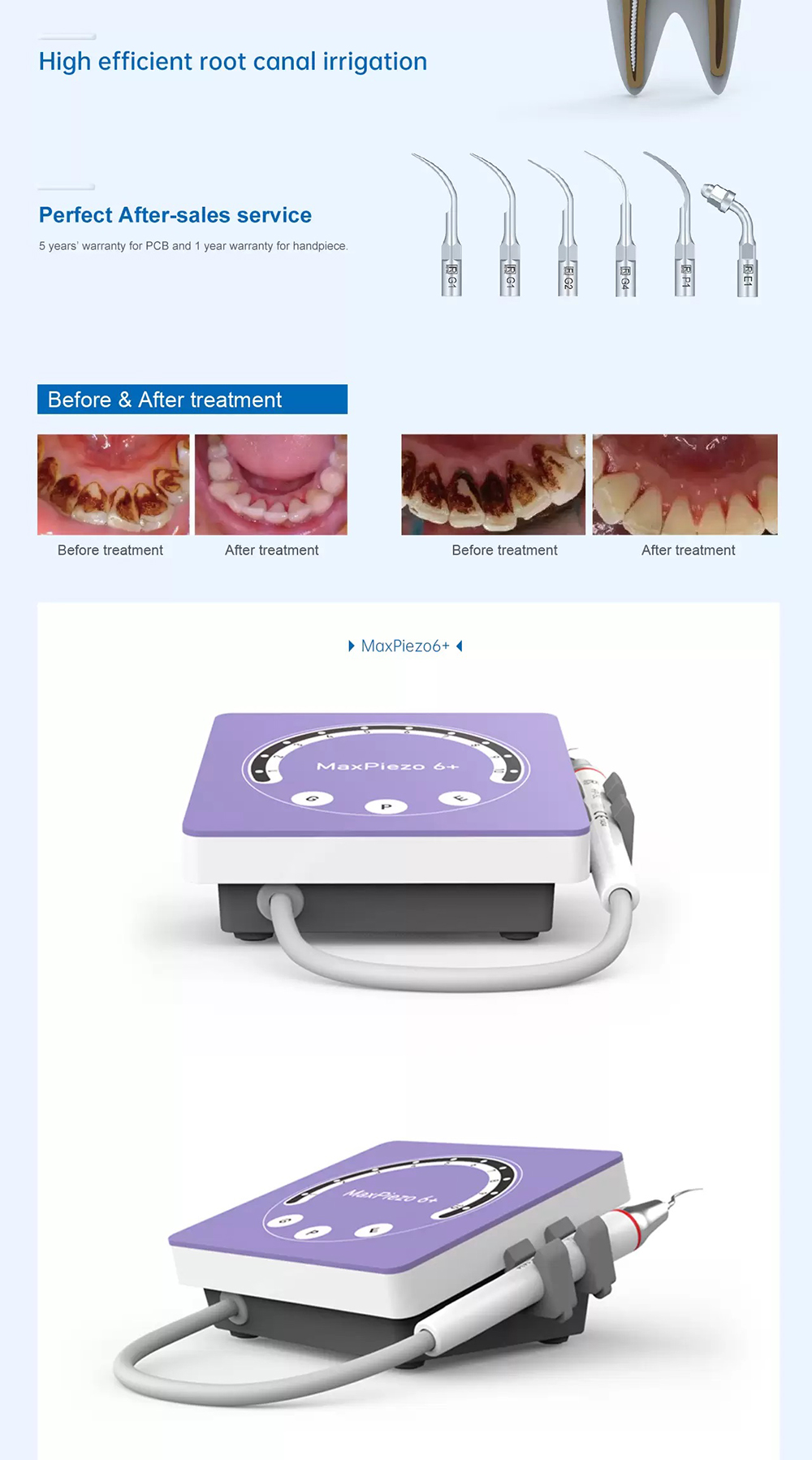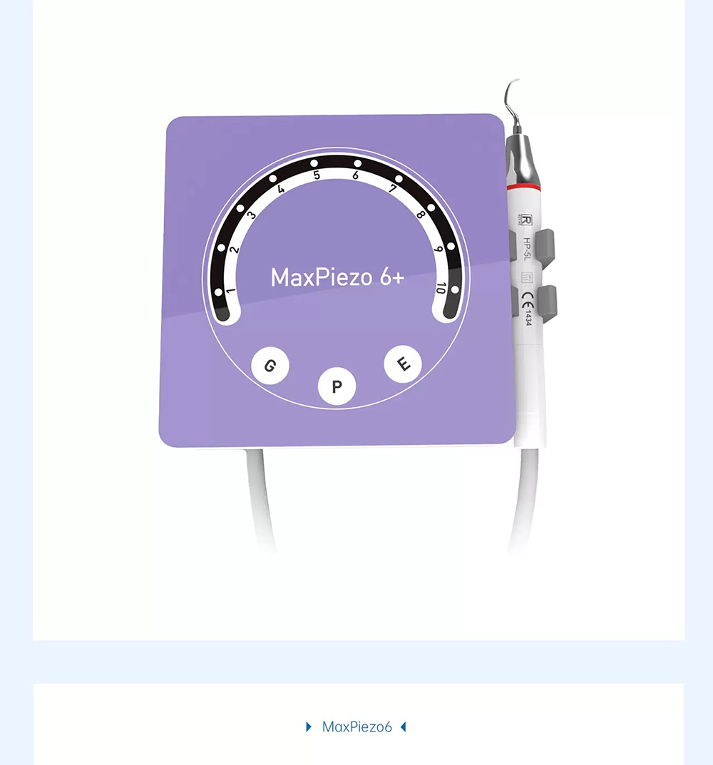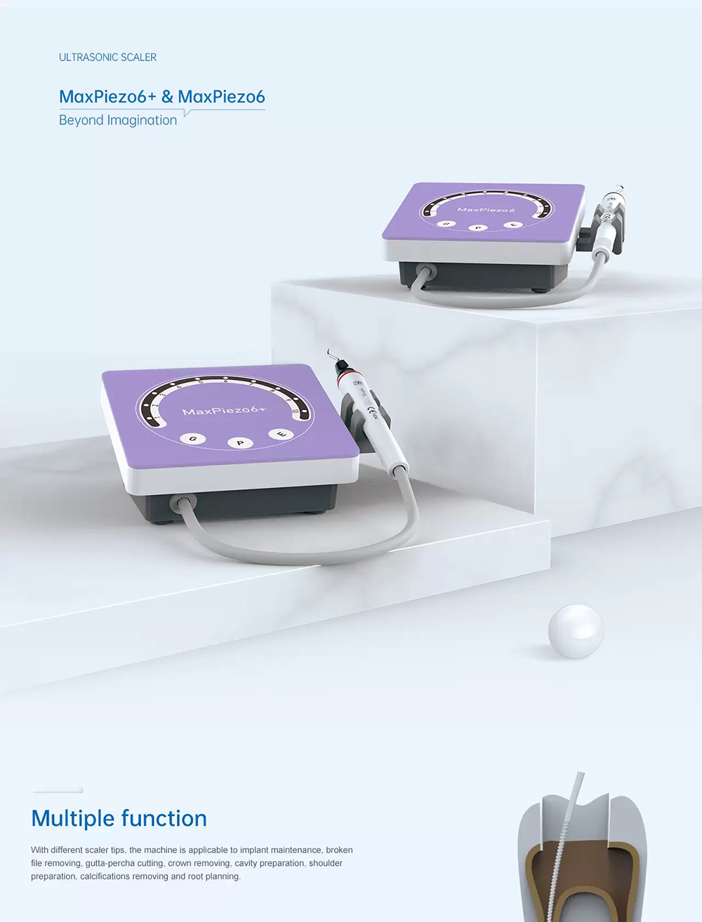 Model description MaxPiezo6+: With LED fiber, compatible with EMS MaxPiezo6: Without LED fiber, compatible with EMS Multiple function: With different scaler tips, the machine is suitable for implant care, removing broken files, cutting gutta percha, removing crowns, preparing cavities, preparing shoulders, removing calcification and root planning.PRODUCT PARAMETERSPRODUCT PHOTOS